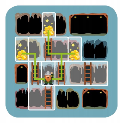 Umieść 3 elementy układanki drabiny na planszy tak, aby krasnoludek mógł iść w górę albo w dół, i dotrzeć do skarbu.