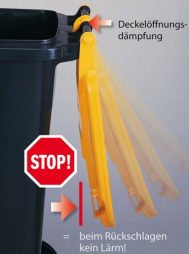 - wyciszenie otwierania pojemnika dzięki specjalnej konstrukcji klapy, zgodnie z dyrektywą: 2000/14/EG