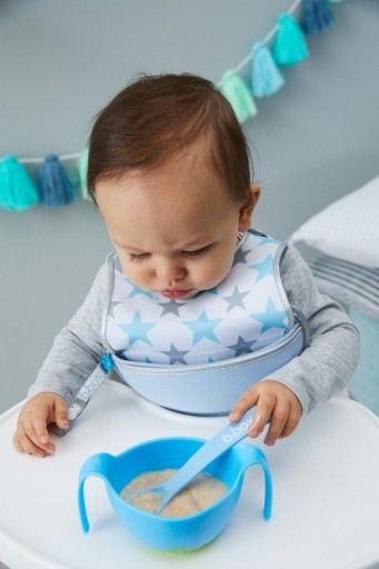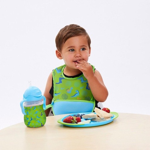 Śliniak został specjalnie zaprojektowany dla dzieci, które zaczynają jeść samodzielnie oraz dla tych mniejszych, które potrzebują pomocy rodziców przy jedzeniu.