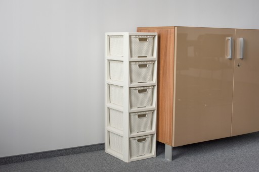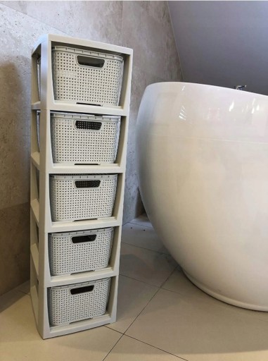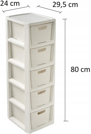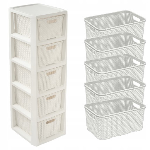 Produkt składa się z 5 pojemników, które pełnią funkcję szuflad. Zostały wykonane z tworzywa sztucznego, ale swoim wyglądem przypominają rattanowe kosze. Dzięki temu prezentują się bardzo estetycznie.
