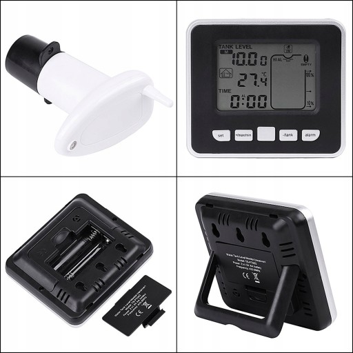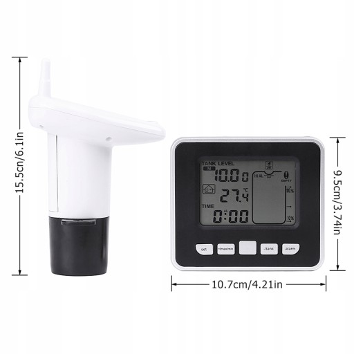 - Miej oko na swój zewnętrzny zbiornik na wodę w zaciszu własnego salonu, z odległości do 100 m. Zainstalowany w górnej części zbiornika wody nadajnik mierzy poziom wody za pomocą czujnika ultradźwiękowego i temperaturę za pomocą czujnika termicznego. Odbiornik można powiesić na ścianie lub wysunąć stojak i postawić na blacie kuchennym, stole lub biurku. Wyświetl temperaturę w pomieszczeniu, temperaturę zbiornika i poziom wody (reprezentowane przez 10-elementowy wykres słupkowy). Możesz przechowywać rekordy min/maks i ustawiać alarmy dla określonych poziomów wody (wysoki/niski) lub gdy jest pusty.
