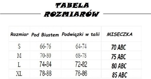 Rozmiar L - Pod biustem ( 74-84 cm), Podwiązki w talii ( 72-82 cm), Miseczka (80 ABC)