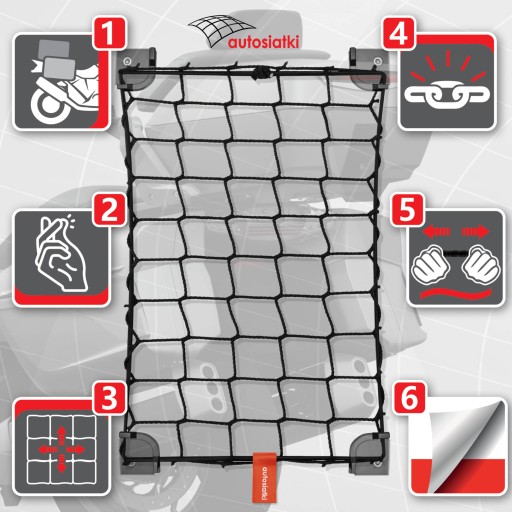 Wytrzymała siatka w gumowym oplocie. Montowana do fabrycznych uchwytów w pokrywie górnej kufra. Pomaga wykorzystać dodatkowe miejsce na bagaż, stabilizuje mniejsze akcesoria, zwiększa organizację przestrzeni w kufrze.