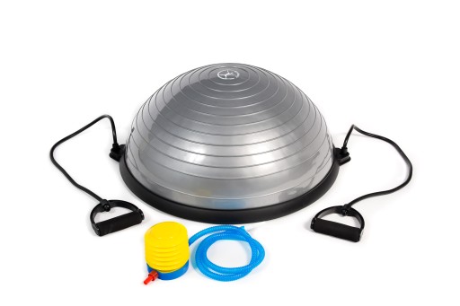 Opis : Trener równowagi z linkami (połowa piłki) to przyrząd gimnastyczny, na którym można ćwiczyć zarówno w domu jak i w klubach fitness, czy siłowni. Obie strony mogą służyć do treningu (stąd nazwa, ang. both sides up). Dzięki swojej budowie może być stosowana na wiele różnych sposobów. W zależności od stosowanego rodzaju treningu wpływa między innymi na poprawę koordynacji ruchowej, stabilizację, wzmocnienie mięśni posturalnych oraz korekcję postawy ciała. Trener równowagi z linkami idealnie sprawdza się również jako trening przygotowujący organizm do konkretnych dyscyplin jak na przykład narty, snowboard, tenis. Ponadto może też pomóc w treningu prewencyjnym i uzupełniającym. Linki znajdujące się w zestawie pozwalają zwiększyć ilość zaangażowanych grup mięśniowych podczas treningu. W zestawie dołączona jest pompka.