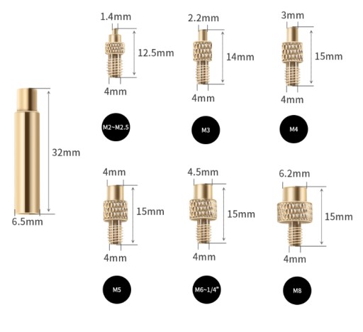 Zestaw składa się z przejściówki do lutownicy i 6 grotów umożliwiających montaż wszystkich rozmiarów insertów: (M2 M2,5 wspólne), M3, M4, M5, M6, M8.