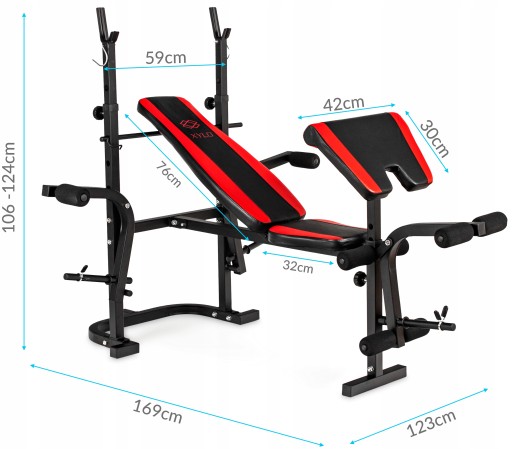 - Ławka z modlitewnikiem, regulowanym oparciem, uchwytami do rozpiętek i prasą do treningu mięśni nóg.