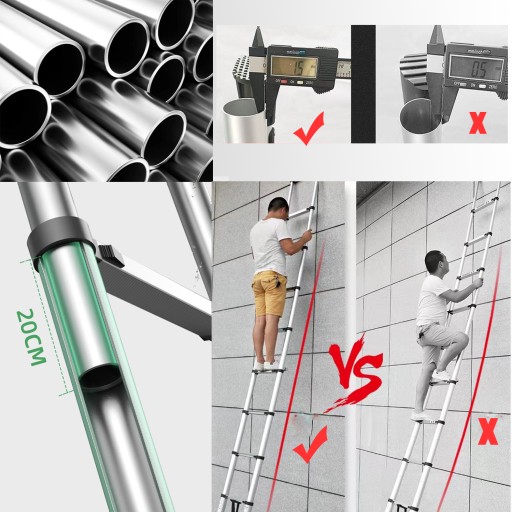 - Drabina teleskopowa Hooha wykorzystuje rurę ze stopu aluminium 6063 o wysokiej wytrzymałości i wysokiej, wysokiej jakości, bezpiecznej, grubości małych rur stalowych na rynku wynosi tylko 0,99 mm, nasza grubość ma 1,5 mm.