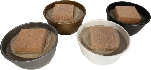 Miska koloru grafitowego obciążona zaprawą cementową i suchą kostką oasis umieszczoną na środku.