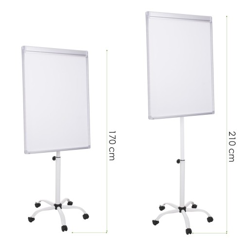 Flipchart oposiada regulację wysokości od 170cm do 210cm. Dzięki temu można dopasować go indywidualnie do wzrostu użytkownika.