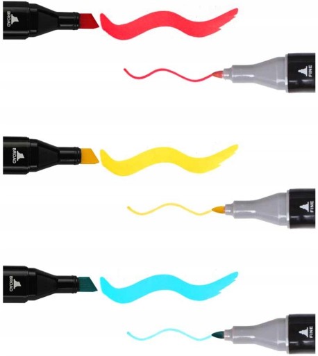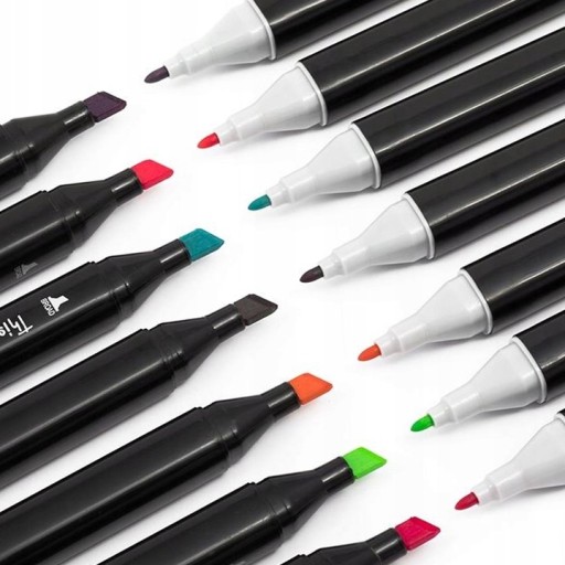 - DWIE KOŃCÓWKI - szeroka i płaska oraz cienka i punktowa, dają ogromne możliwości twórcze. Końcówki wykonano z bardzo trwałego tworzywa, dzięki czemu markery będą służyć przez bardzo długo.