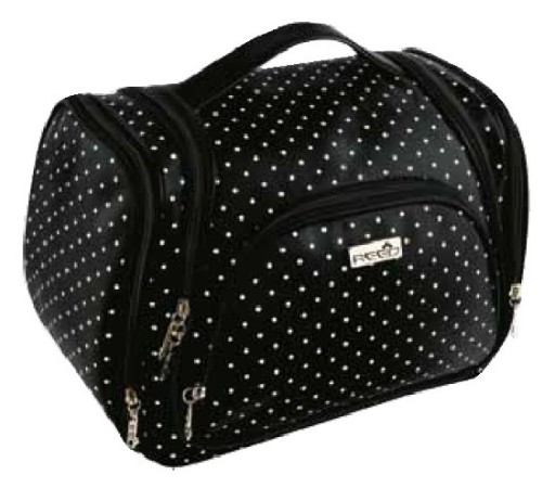 Piękna kosmetyczka wykonana z czarnego lekko błyszczącego, nieprzemakalnego materiału w białe groszki. Wnętrze kosmetyczki w ślicznym różowym kolorze. Pojemna, niezwykle funkcjonalna i wygodna. W środku dwie kieszonki z siateczki, z czego jedna z nich na zameczek. Z boku wygodna rączka ułatwiająca noszenie. Idealna na długie wyjazdy i na co dzień. Z przodu eleganckie, metalowe logo REED.