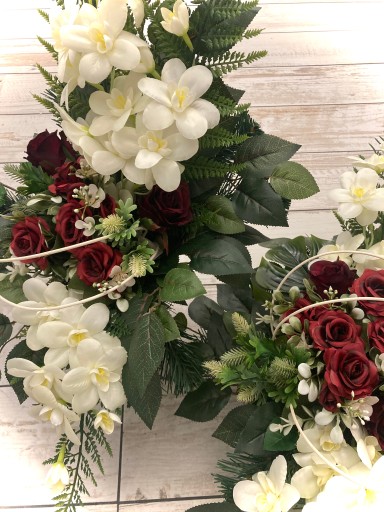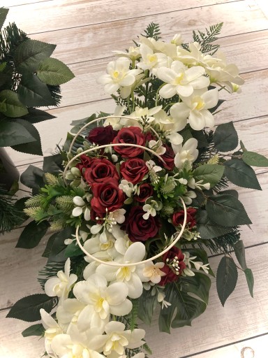 Przedmiotem sprzedaży jest efektowna wiązanka ze sztucznych, dobrej jakości kwiatów, w obciążonej misie w komplecie z wkładem do wazonu idealnie pasującego do głównego stroika.
