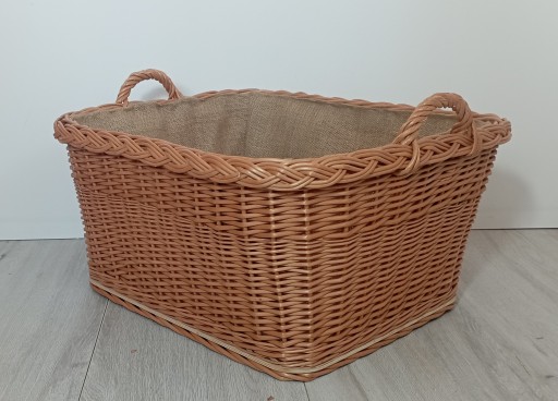 Duży wiklinowy kosz na drewno wykonany z najwyższej jakości wikliny. Bardzo mocne uchwyty i solidna konstrukcja są gwarancją trwałości kosza. Koszyk w środku został wyścielony materiałem z juty, dzięki czemu pozostałości drewna nie będą wysypywały się przez szczeliny kosza.