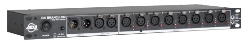 D4 Branch RM™ to 4-drożny rozdzielacz/wzmacniacz z pojedynczą przestrzenią rackową z 3-pinowymi i 5-pinowymi gniazdami wejściowymi i wyjściowymi XLR.
