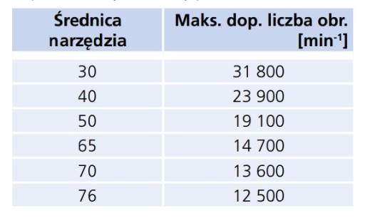 Należy bezwzględnie przestrzegać maksymalnej ilości obrotów na minutę tarczy tnącej i jej trzpienia mocującego - decydująca jest najniższa wartość (patrz tabela po lewej stronie)