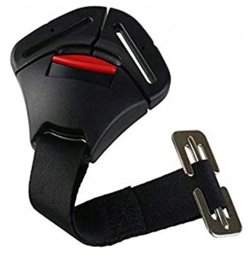 Pas z metalowym klipsem blokującym utrzymuje podstawę fotelika na miejscu, zapobiegając zsuwaniu się pasa na zawsze.