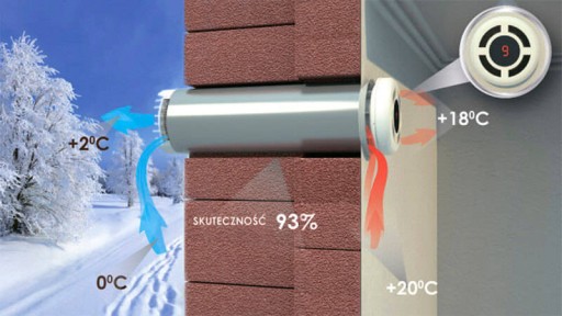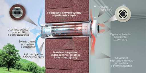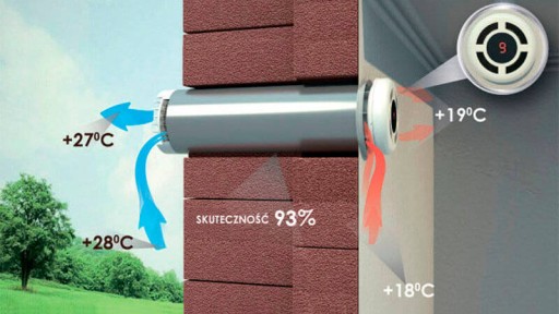 W ten sposób cały moduł operacyjny znajduje się wewnątrz ściany, a widoczne pozostają wyłącznie kraty wentylacyjne wewnątrz pomieszczenia i na elewacji. Otwór przelotowy należy wykonać ze spadkiem pod kątem 3-5 stopni na zewnątrz budynku. Długość modułu operacyjnego odpowiada grubości ściany, w której jest zamontowane urządzenie, z uwzględnieniem konieczności wysunięcia części wylotowej rekuperatora nie mniej niż 5mm. System wentylacji podłącza się do sieci stacjonarnej o napięciu 230V i częstotliwości 50Hz.
