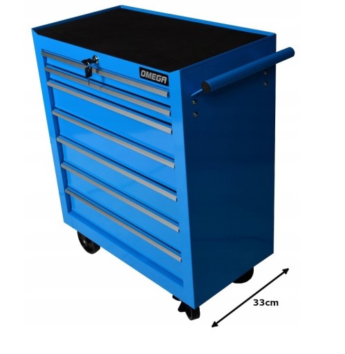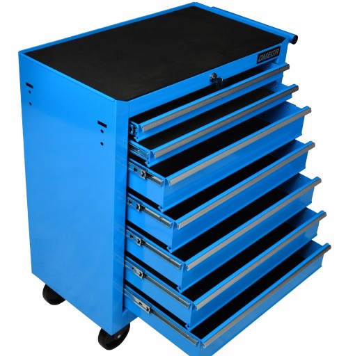 Wózek narzędziowy z siedmioma szufladami bez wyposażenia. Kompaktowa budowa sprawia, że polecany jest szczególnie do warsztatów samochodowych lub garaży. Konstrukcja stalowa, blat wyłożony gumą.