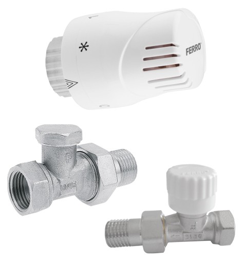 - Zawartość zestawu głowica termostatyczna, zawór termostatyczny bez nastawy wstępnej, zawór odcinający