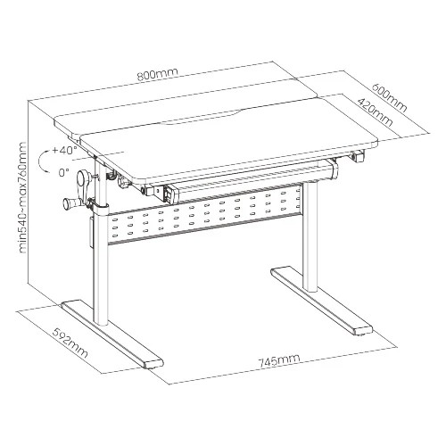 Pochylany pulpit w zakresie 0-40 stopni pozwala osiągnąć ergonomiczne kąty do czytania, pisania i rysowania. Dzięki tej konstrukcji stół może zapewnić wygodne pozycje do pracy i pomaga uniknąć bólu szyi oraz kręgosłupa. Po ustawieniu pochylenia, należy dokręcić pokrętło zabezpieczające, dzięki czemu mamy pewność, że biurko pozostanie w aktualnym ustawieniu.