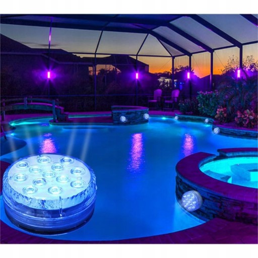 Oświetlenie basenowe - 16 kolorowych lampek, które doskonale doświetlą basen, fontanny lub akwarium. Lampki posiadają 13 mocnych, wysokiej jakości diod LED sterowanych za pomocą pilota.