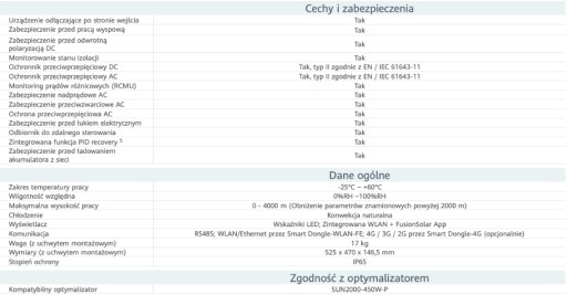 - Komunikacja poprzez RS 485, LAN/WLAN oraz sieć LTE za pośrednictwem Smart Dongle, umożliwiająca monitorowanie i sterowanie.