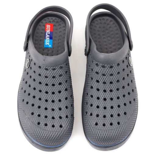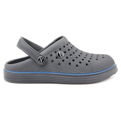 Klapki młodzieżowe typu kroksy na płaskiej podeszwie z lamówka dookoła. Wsuwane, z okragłym noskiem. Ozdobione wyciętymi dziurami w kształcie kółek na cholewce. W tylnej części pasek dodatkowo trzymający stopę. W całości wykonane z gumowego tworzywa. Idealne na basem jak również na codzień.