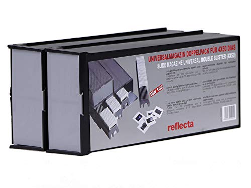 Pojemniki UNIVERSAL na 50 sztuk ramek w opakowaniu, które zawiera 4 sztuki w 2 pudełkach archiwizacyjnych. Ten typ magazynka jest przeznaczony do wszystkich popularnych typów projektorów slajdów i różnych wzorów ramek o szerokości do 3 mm, w tym szklanych. Wykonanie zgodnie z normą DIN 108.