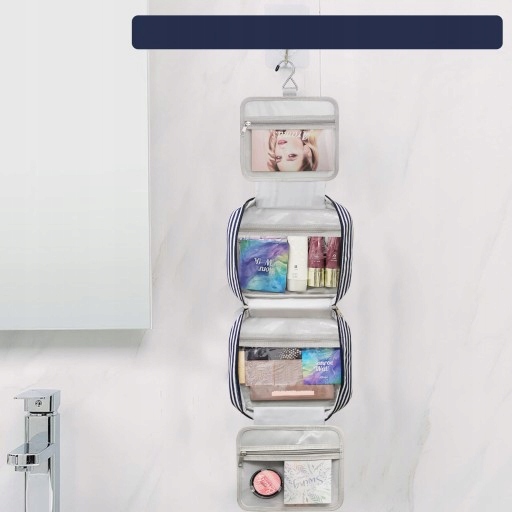 - Kosmetyczka posiada solidny haczyk, który umożliwia powieszenie przyborów toaletowych w kształcie wieszaka na ręczniki, wieszaka na ubrania i nie tylko.