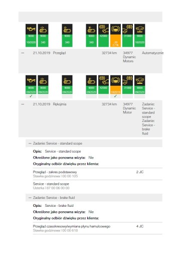 - wszystkie wizyty serwisowe; z datami, przebiegami, wykonanymi operacjami, adresem serwisu,