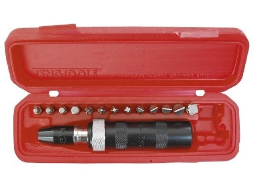 Zestaw składa się z 15 elementów. Z nastawianiem kierunku obrotów prawo-lewo. Podstawowy chwyt wkrętaka to kwadrat 1/2", ale wyposażony jest on również w uchwyt umożliwiający osadzanie grotów z chwytem sześciokątnym 5/16". Zawiera trzpień przejściowy (adapter) 5/16-3/8, uchwyt do grotów 1/2"- 5/16" oraz 12 różnych grotów wkrętakowych. Dostarczany w pudełku z tworzywa sztucznego.