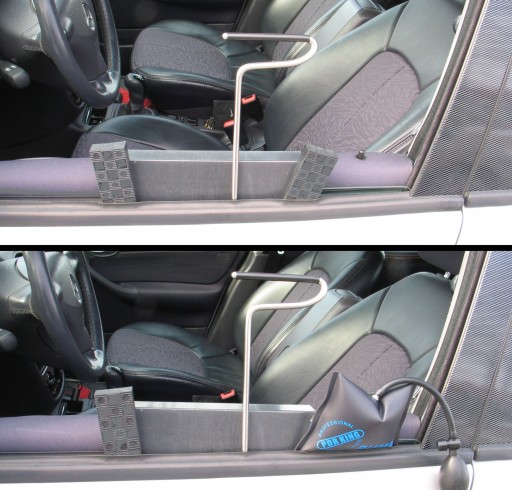 - Przy pomocy osłony i klinów ochraniamy szybę w oknie drzwi podczas naprawy metodą wypychania prętami