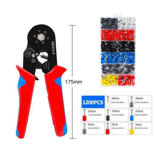 Zaciskarka do konektorów końcówek w zestawie z aż 1200 tulejkami różnych rozmiarów. To niezawodne narzędzie, które umożliwi Ci profesjonalne i precyzyjne zaciskanie tulejek izolowanych i nieizolowanych. Nasz zestaw to kompletna i praktyczna oferta, która sprawdzi się zarówno w profesjonalnych instalacjach elektrycznych, jak i w domowym warsztacie.