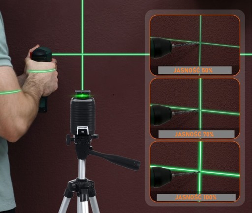 ZA POMOCĄ JEDNEGO PRZYCISKU MOŻEMY ZMIENIĆ MOC ŚWIECENIA WIĄZKI LASERA, DZIĘKI CZEMU WYDŁUŻYMY CZAS PRACY JAK I W W JASNYCH POMIESZCZENIACH POPRAWIMY JEJ WIDOCZNOŚĆ