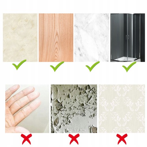 Nadaje się tylko do gładkich nieporowatych powierzchni: panel metalowy, płytki, marmur, szkło, deska drewniana, powierzchnia z tworzywa sztucznego. . . Nie nadaje się do szorstkich i nieprzywierających powierzchni: ściany malowane, płyty gipsowo-kartonowe, tapety, ściany wapienne, ściany bielone, ściany z chropowatego cementu, ściany z cegły, ściany betonowe i nierówne powierzchnie.