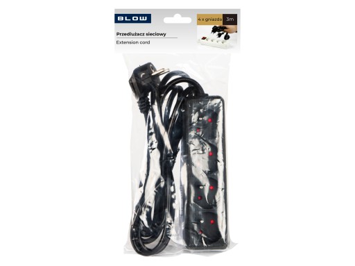 Przedłużacz sieciowy BLOW w kolorze czarnym z czterema gniazdami przeznaczony do użytku domowego. Przedłużacz pozwala podłączyć urządzenia, które są oddalone od gniazda elektrycznego. Produkt z jednej strony posiada 4 gniazda obrócone pod kątem a z drugiej pojedynczy kątowy wtyk sieciowy.