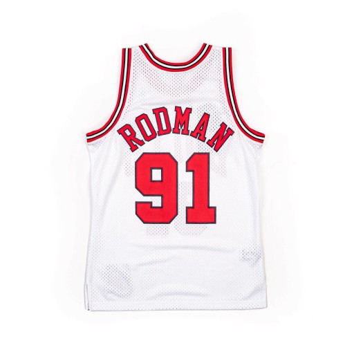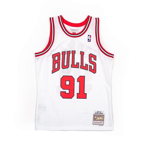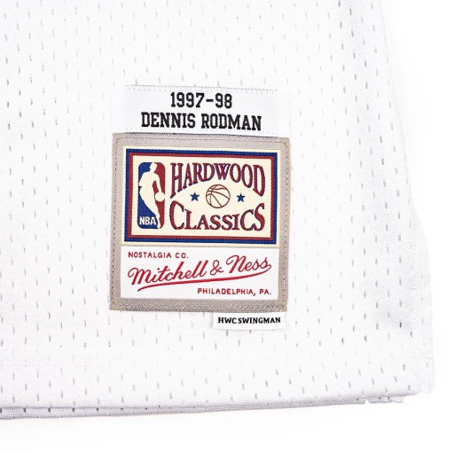 Swingman Jersey Mitchell & Ness. Koszulka odwzorowuje oryginalne stroje drużyny Chicago Bulls Sezonu 1997-98. Z tyłu nazwisko gracza- Dennis Rodman oraz numer zawodnika.