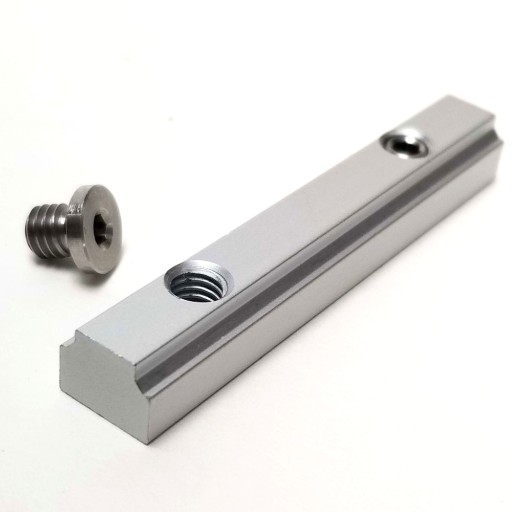1. wsuwka-ślizg do profili T-track - akcesorium posiada 2 gwintowane otwory o średnicy M6. Pozwalają one na budowanie własnych przesuwnych przyrządów (stoperów, prowadnic, itp). Zawarte w zestawie śruby blokujące umożliwiają przyblokowanie wsuwki nieruchomo w jednym miejscu i szybką regulację jej położenia w profilu.