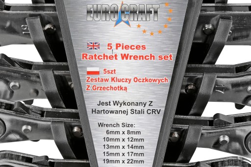 Zestaw 5 kluczy płasko oczkowych z grzechotkami. Niezwykle mocny mechanizm zębatkowy wykonany został ze stali hartowanej. Mechanizm grzechotki jest precyzyjny i wytrzymały dzięki swojej konstrukcji oferuje nam 5° skok klucza. Specjalnie zaprojektowany mechanizm jest odporny na zużycie oraz uszkodzenia. W zestawie organizer z tworzywa sztucznego.
