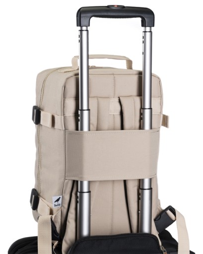 Plecak został wyposażony w możliwość szybkiego odpinania szelek i umożliwienia komfortowego nałożenia na rączkę walizki.