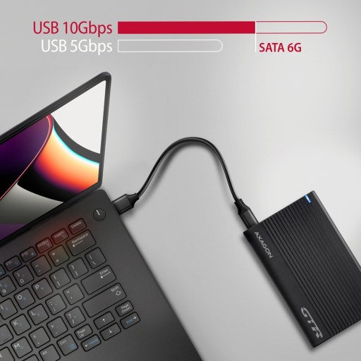 Żebrowana aluminiowa zewnętrzna obudowa AXAGON EE25-GTR RIBBED z interfejsem USB-C 10Gbps przeznaczony dla dysków twardych 2.5 " SATA lub SSD. Niezawodne połączenie z komputerem zapewnia znajdujące się na pudełku dwustronne złącze USB-C wraz z dołączonym kablem USB-C - > USB-A oraz adapterom USB-A - > USB-C.