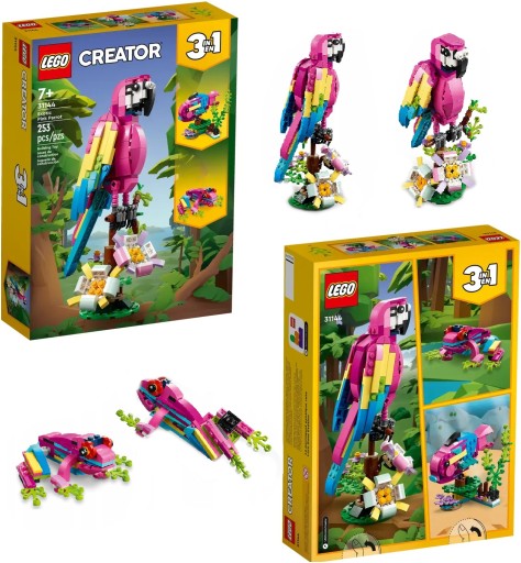 Dzięki zestawowi LEGO® Creator 3 w 1 Egzotyczna różowa papuga (31144) mali budowniczowie i wielbiciele zwierząt w wieku od siedmiu lat wybiorą się w emocjonującą podróż do lasu deszczowego. Zestaw zawiera różowo-niebieską papugę, która może obracać ciało, siedząc na gałęzi, a także poruszać skrzydłami i ogonem.