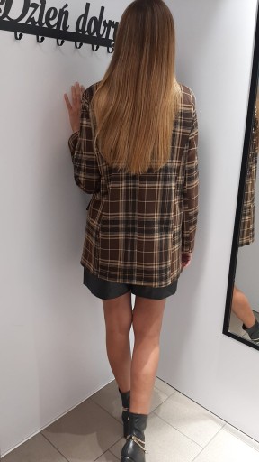 - Piękna marynarka w kratkę z podszewką, zapinana na guzik, na ramionach poduszki. Luźny fason.
