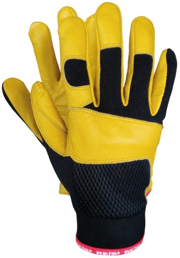 - Rękawice ochronne wykonane z wysokiej jakości skóry koziej połączonej z tkaniną. skóra kozia licowa w żółtym kolorze.