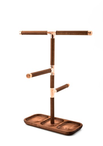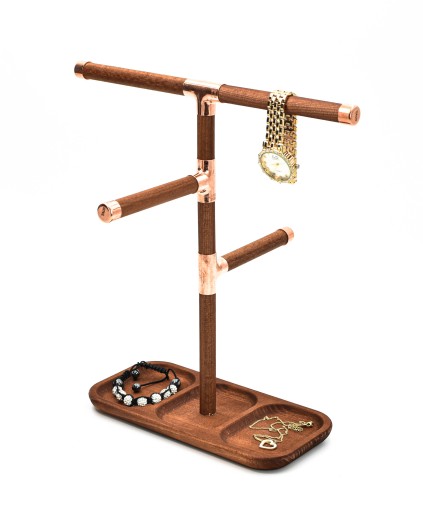 Ekspozytor wykonany z drewna i łączników miedzianych. Głównie służy do zawieszania zegarków, bransoletek, łańcuszków i innej biżuterii. Uporządkuje i wyeksponuję Twoja biżuterię.