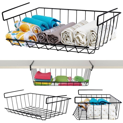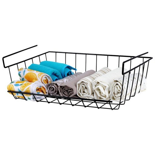 Черная металлическая корзина, подвешенная под полкой.