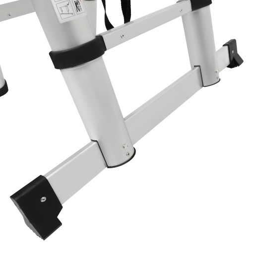 Drabina teleskopowa ma trwałą aluminiową konstrukcję, przemysłowe zatrzaski blokujące wysokość i solidne gumowe nóżki.