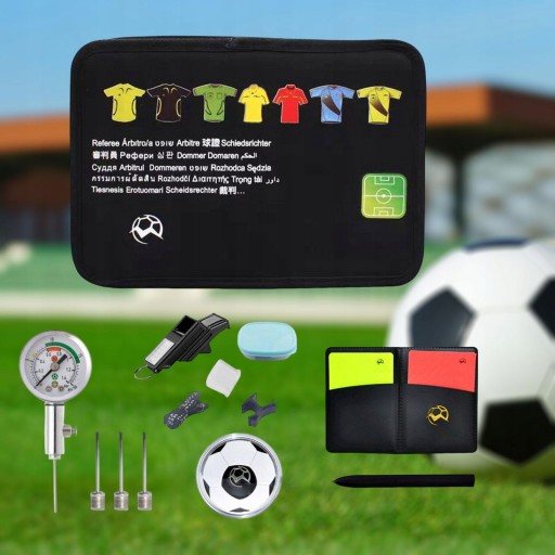 Profesjonalny zestaw akcesoriów dla sędziego piłkarskiego: zawiera gwizdek, manometr, ołówek i torbę do przechowywania itp.