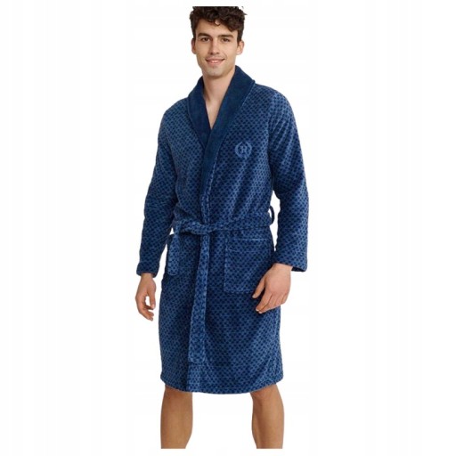 Elegancki męski szlafrok HENDERSON UNIX w kolorze granatowo niebieskim został wykonany z miękkiej, polarowej tkaniny, zapewniającej komfort i dobrze utrzymującej ciepło. Na wysokości piersi znajduje się haft z logo marki. To niezwykle wygodny szlafrok o luźnym i swobodnym kroju oraz długości do kolan. Jest wiązany w talii przy pomocy szerokiego paska, a kopertowy przód, szeroki kołnierz i dwie duże kieszenie na drobiazgi dodają mu praktyczności.