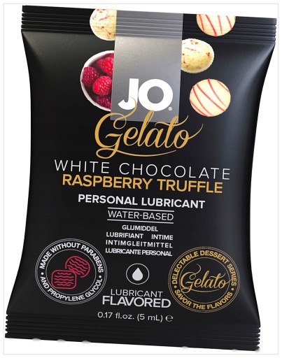 Lubrykant o smaku maliny w białej czekoladzie System JO z naszej kolekcji galateo pozwala cieszyć się figlarnymi smakami słodkich cukierków i znanych deserów.